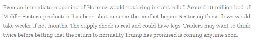 文章最后说,即使霍尔木兹海峡立即重新开放,也无法带来高油价的即刻缓解。自军事打击开始以来,中东地区每日约1000万桶的产量已被关闭。恢复这些供应将需要数周,甚至数月的时间。供应冲击是真实存在的,并且可能持续下去。人们如果押注美国政府承诺的恢复正常会很快到来,可能需要三思。