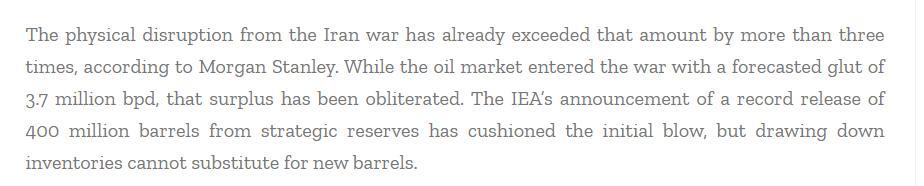 文章援引摩根士丹利的数据称,美国和以色列对伊朗发动的军事打击造成的实际供应中断规模已是这一数字的三倍多。尽管石油市场在战前预计每日供应过剩370万桶,但这部分过剩产能已被抹去。国际能源署宣布从战略储备中创纪录地释放4亿桶石油,这缓解了对市场的最初的冲击,但消耗库存无法替代新增供应。