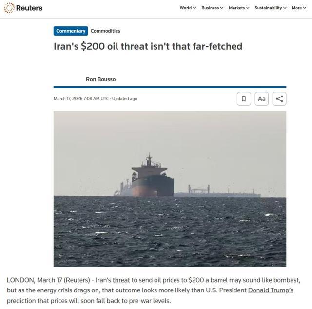 自美以开始军事打击伊朗,油价一直是国际社会关注的焦点之一。3月17日,国际油价主要基准美国WTI原油期货报93.69美元/桶,伦敦布伦特原油期货报100.65美元/桶,仍旧维持高位。路透社近日刊文称,随着能源危机持续不退,此前伊朗曾宣称的“油价会达到每桶200美元”或将成为现实。