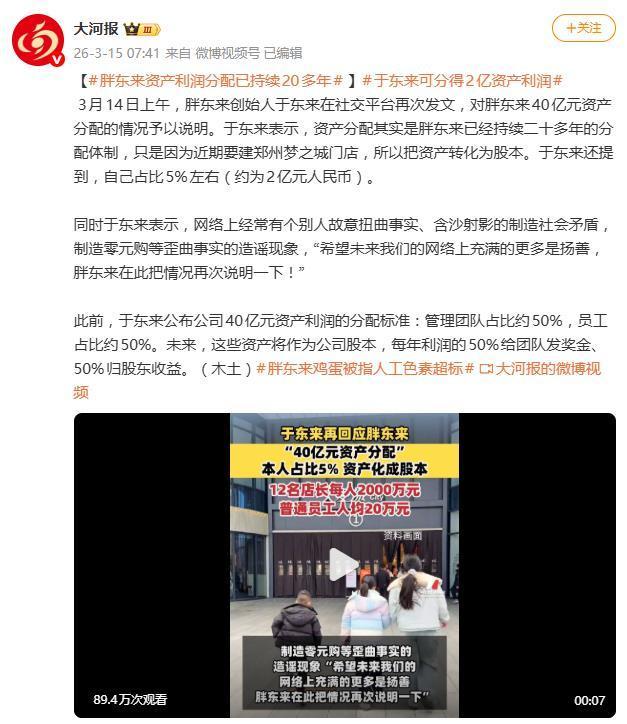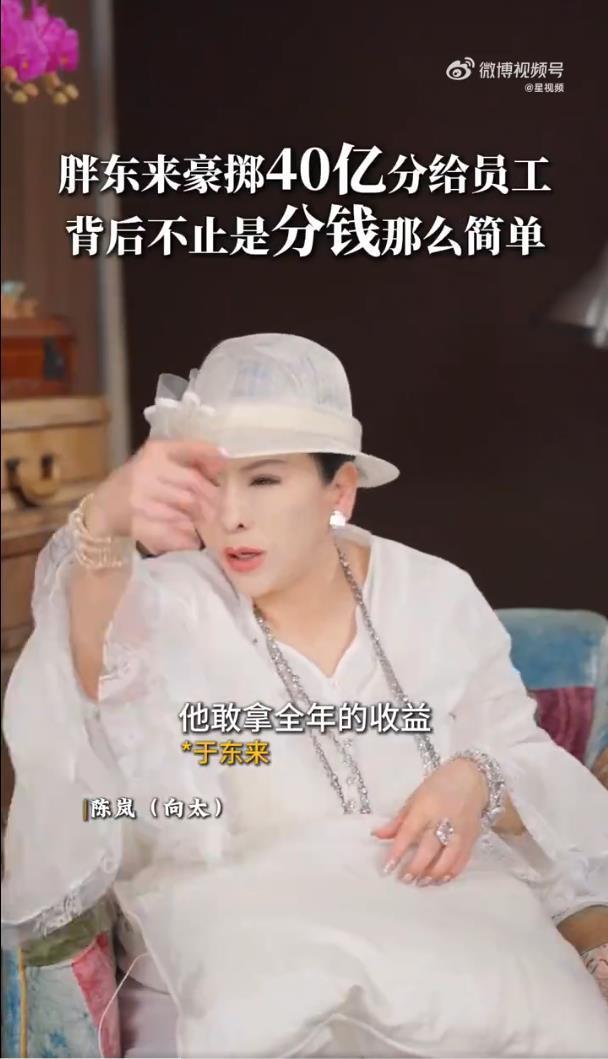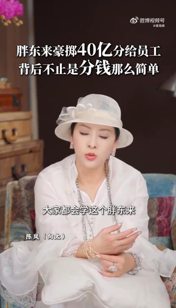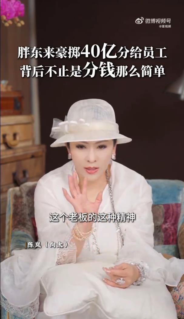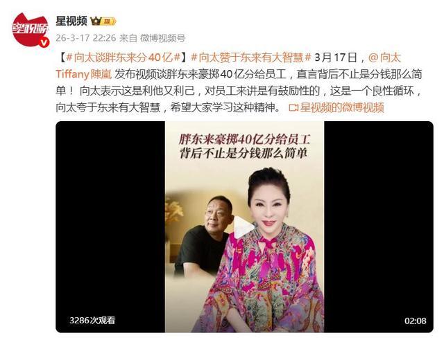据3月17日晚间报道,向太陈岚这次没聊珠宝豪宅,反倒为一家长期在热搜上的超市“站台”发声了。向太发布视频,专门谈起胖东来创始人于东来豪掷40亿分给员工的“壮举”,直言这操作“有大智慧”,并隔空喊话企业主们:希望大家学习这种精神!